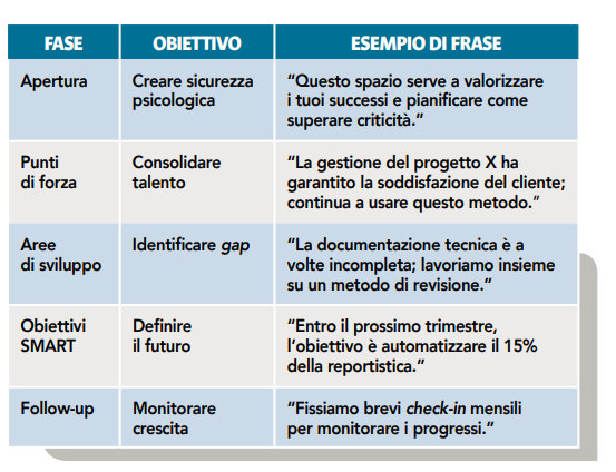 • relazione, attraverso un dialogo autentico e bidirezionale. Un errore frequente è il cosiddetto “effetto sorpresa”: feedback critici mai anticipati che arrivano tutti insieme. Questo genera uno shock psicologico e può portare a disimpegno, con cali di coinvolgimento che, secondo studi Harvard, possono arrivare fino al 35%. La review dovrebbe quindi consolidare quanto già emerso nel tempo, non introdurre giudizi inattesi. Ecco uno schema utile per gestire efficacemente il colloquio di valutazione: